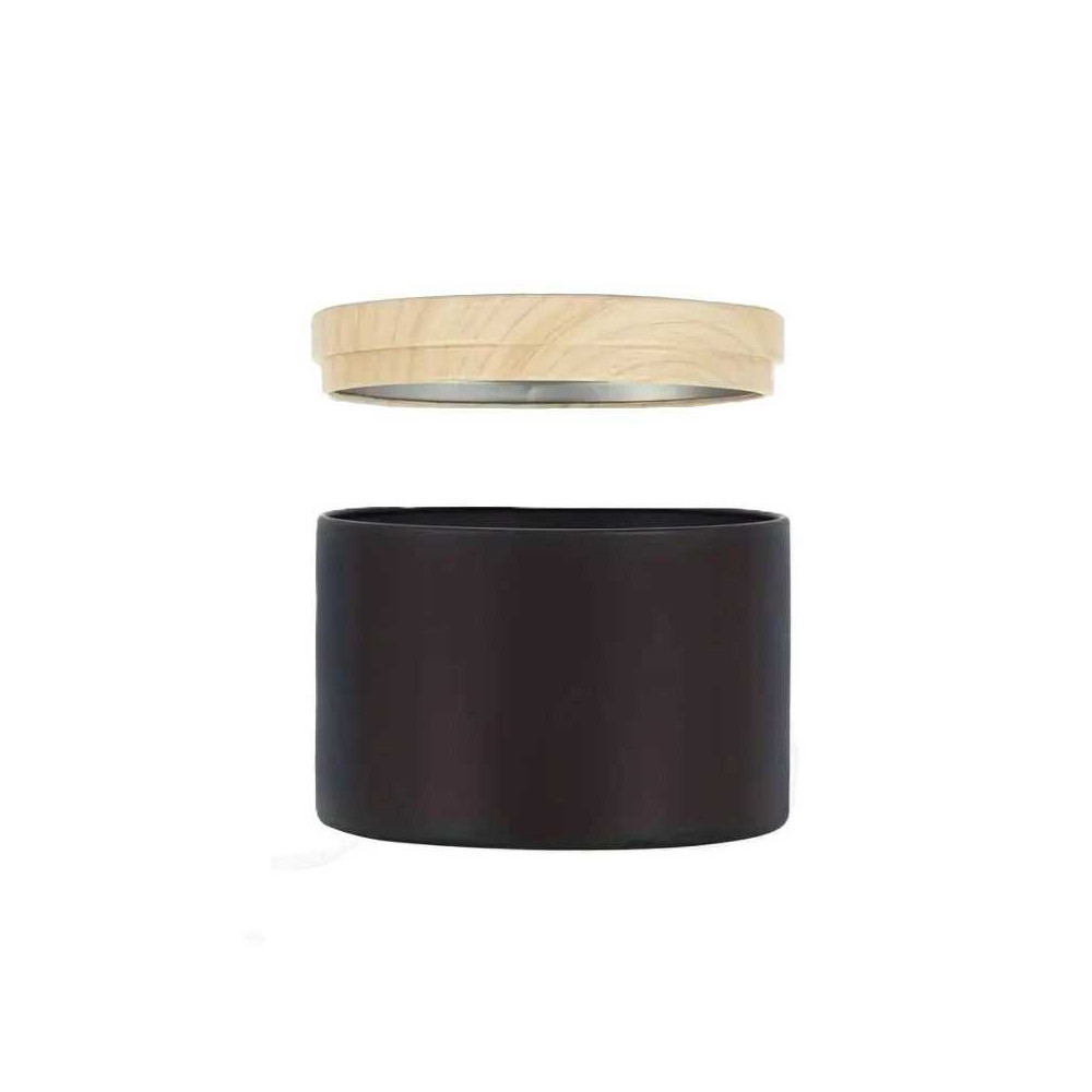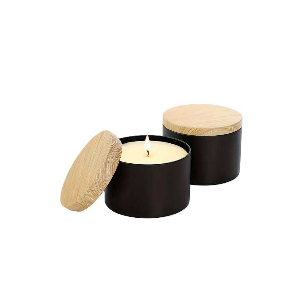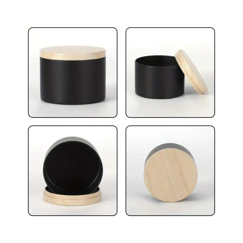 Plechová dóza na svíčky průměr 6,5cm, výška 5,2cm, dóza černá, víčko dřevodekor.