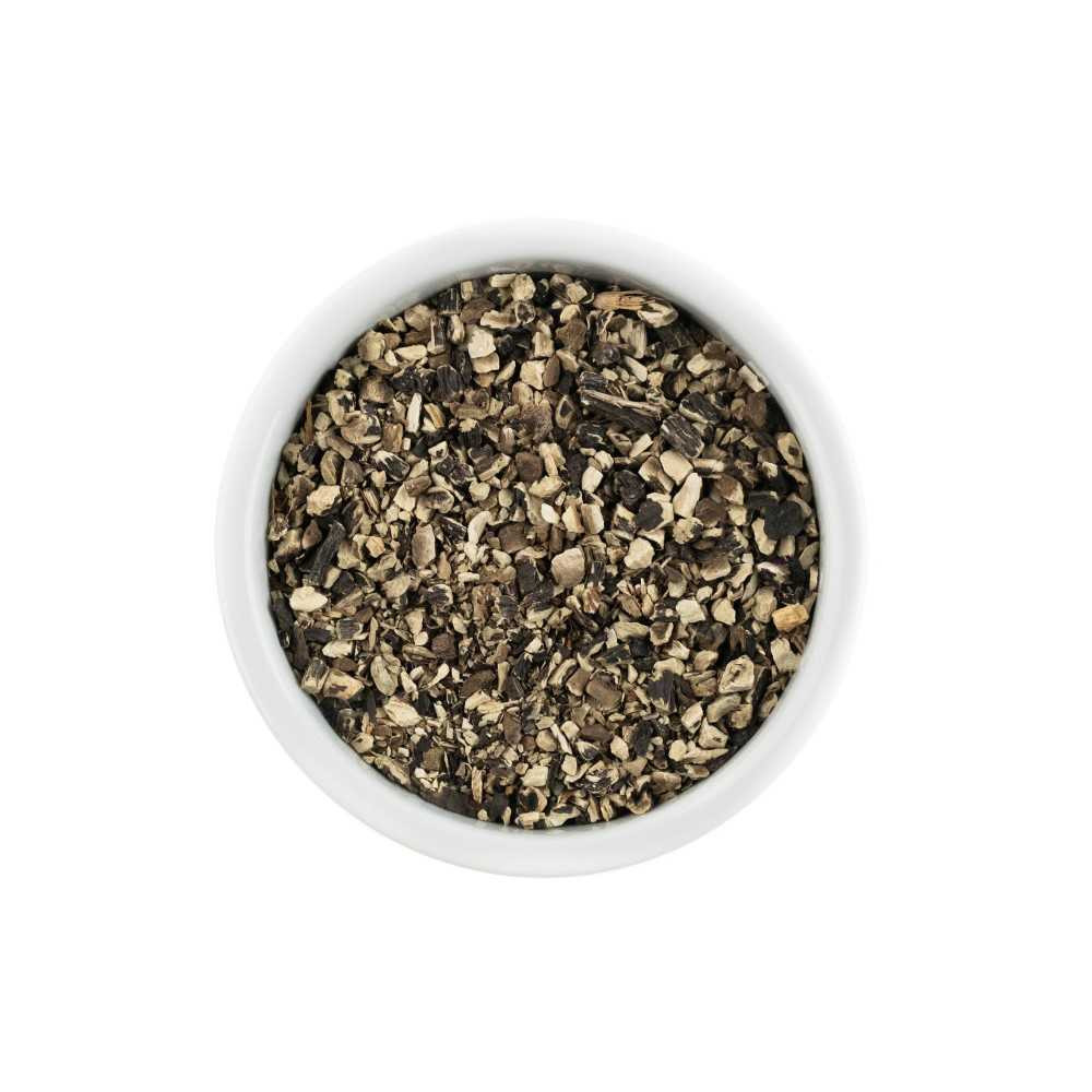 Sušený nařezaný kořen kostivalu lékařského, který je zvenku černý a vevnitř bílý. Kostival lékařský je trvalá bylina s řepovitým černým kořenem, kopinatými drsnými listy a fialovými květy. Plodem jsou lesklé tvrdky. Jeho léčivé a hojivé účinky jsou známé už od středověku. Obsahuje vitamíny (např. vitamín A, C, B12), minerály (např. vápník, draslík, fosfor) alantoin, tanin a mnoho dalších prospěšných živin.